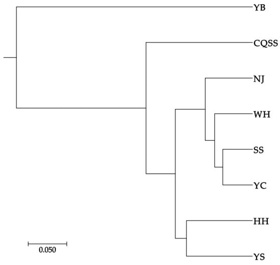 The maximum genetic distance among eight populations was 0.827 (YB/WH) and the minimum genetic distance was 0.226 (SS/WH) (Table 10). The unweighted paired average method (UPGMA) based on Nei genetic distance was used for cluster analysis. The UPGMA phylogram showed that there were two branches, YB population was located in one independent branch, and the other seven populations were located in another independent branch (Figure 3).