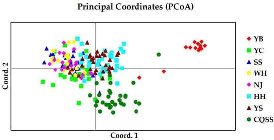 PCoA of eight populations of Hemibagrus macropterus based on SSRs. YB, Yibin; YC, Yichang; SS, Shishou; WH, Wuhan; NJ, Nanjing; HH, Huaihua; YS, Yangshuo; CQSS, Stock seed.