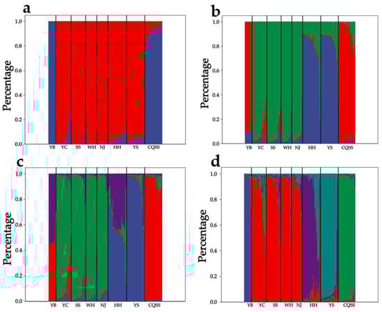 (a) Structural diagram of Hemibagrus macropterus for K = 2; (b) Structural diagram of Hemibagrus macropterus for K = 3; (c) Structural diagram of Hemibagrus macropterus for K = 4; (d) Structural diagram of Hemibagrus macropterus for K = 5. Different colors represent different clustering subgroups. YB, Yibin; YC, Yichang; SS, Shishou; WH, Wuhan; NJ, Nanjing; HH, Huaihua; YS, Yangshuo; CQSS, Stock seed.