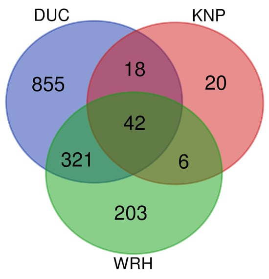 Genes overlapping with CNVRs were retrieved for each of the populations based on the Sus scrofa 11.1 genome assembly. A total of 1236 genes were retrieved for the DUC population, while 86 genes were identified for KNP and 572 for WRH (Figure 2). In DUC, 323 CNVRs (47.43% of CNVRs) covered the whole or part of gene regions. For KNP and WRH, genes were identified in 59 CNVRs (8.66%) and 187 CNVRs (27.46%), respectively (Table S2). The functional annotation clusters (ACs) represent groups of related functions and pathways among the genes overlapping CNVRs. Although the clusters do not prove direct interactions, it provides insights into shared biological processes in WRH. The analysis revealed nine ACs in DUC, two ACs in KNP, and four ACs in WRH. In the DUC population, several significant ACs were identified: AC1 (enrichment score = 2.91) was related with homeobox genes and transcription factors, while AC3 (enrichment score = 2.45) and AC6 (enrichment score = 1.69) were linked to embryonic skeletal development and neuron differentiation, respectively. Additionally, AC2 (enrichment score = 2.74) was related to the urokinase plasminogen activator receptor and lymphocyte antigen 6. AC4 (enrichment score = 2.04) involved zinc fingers and PHD fingers, indicating roles in molecular interactions and cellular processes. For the KNP population, the two identified ACs were linked to basic protein functions and ubiquitin interactions (AC1: enrichment score = 1.94; AC2: enrichment score = 1.31) (Table S3). The WRH population showed similarities to DUC, with AC1 (enrichment score = 2.12) highlighting zinc finger functions. Additional ACs in WRH were related to cellular communication (AC2: enrichment score = 1.61), the leucine-rich repeat motif (AC3: enrichment score = 1.51), and blood clotting processes (AC4: enrichment score = 1.45) (Table 3).