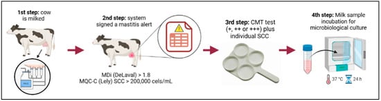 Scheme illustrating the process utilized to determine whether a milk sample from a cow should be sent for microbial culture. The sequence of steps was as follows: (1) Cow was milked, (2) a mastitis alert was signaled by the system (DeLaval AMS MDi > 1.8; Lely AMS MQC-C based on SCC > 200 × 103 cells/mL [16]), (3) quarter samples were submitted to CMT test plus cow’s individual SCC analysis, and (4) mixed-milk sample was incubated for microbiological culture.