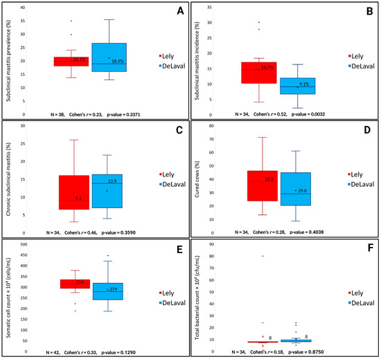 Median comparisons from the Wilcoxon signed-rank test for subclinical mastitis prevalence (A), incidence (B), percentage of cows with chronic subclinical mastitis (C), and cured cows (D), bulk tank milk somatic cell count (E), total bacterial count (F) between Lely and DeLaval AMSs.