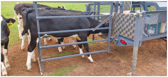 Grazing calves were supplemented with calf-rearer pellets (10 g/calf/day), and additional bait was fed in GreenFeed units used for emission measurements [33]. During visits to the GEM, calves entered an enclosed area or individual feeding stall (Figure 2), where measurements of CH4, CO2, O2, H2, and H2S were taken.