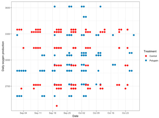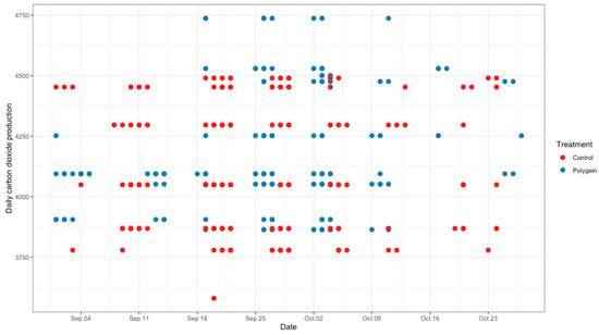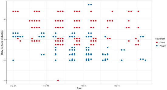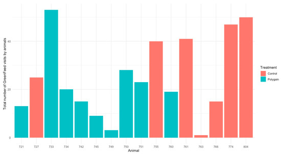 The total number of visits to the GEM by each animal is shown in Figure 3. In terms of the potential benefits of feeding Polygain™ (PG) to growing calves, carbon dioxide (CO2) emission and oxygen (O2) emission were similar (p > 0.05) among the two groups (Table 2). The control animals had consistently a higher daily average methane production compared to PG-supplemented animals from the beginning to the end of the trial (Figure 4). The daily average CO2 and O2 emissions also showed similar and consistent variation among the control and treatment groups over the measurement period (Figure 5 and Figure 6). There was a significant (p < 0.001) effect of PG supplementation on the enteric CH4 emission in calves (Table 2), and the production of CH4 was lower in calves supplemented with the PG (26.66 ± 2.06 g/day) as compared to the control group (35.28 ± 1.39 g/day, p < 0.001; Figure 7). The CO2/O2 ratio in the treatment and control groups differed significantly (p < 0.001), being 235 ± 14 and 183 ± 9.6 in the treatment and the control group, respectively Table 2). Neither H2 nor H2S were exhaled in either group.