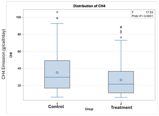 Box plot of methane emissions of experimental calves in the control (standard pellet) and treatment (Polygain™ supplemented pellet) groups.