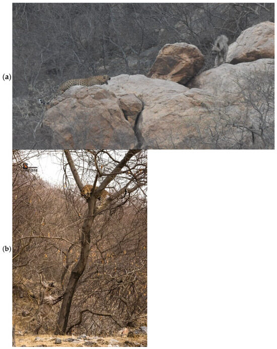 Nevertheless, numerous instances of direct interactions between leopards and striped hyenas have been documented in Jhalana by the authors (Figure 2a) and ecotourists (Figure 2b).