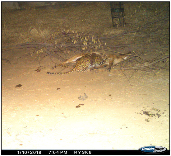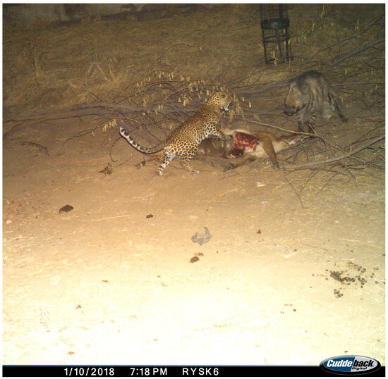 Instances of kleptoparasitism have also been documented, in which hyenas scavenge leopard kills, forcing leopards to either defend their meal or abandon it to avoid injury. Several such incidents have been recorded using 21 motion-sensor camera traps (Cuddeback X-Change Color Model 1279, De Pere, WI, USA) deployed between November 2017 and June 2023 at carcasses brought by the rangers or regularly at the waterholes [18,20], and we present a sequence of events from one such occurrence here.
