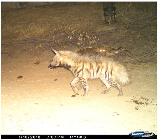 - Hadad, E.; Yosef, R. Unusual intra-specific aggression in Striped Hyena. Acta Ethologica 2025, 1–4. [Google Scholar] [CrossRef]
