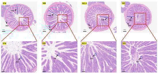 As shown in Figure 1 and Table 10, compared with the FM group, the villus height and goblet cell number in the intestine of hybrid sturgeon significantly decreased in the M0 group (p < 0.05). Compared with the M0 group, these parameters significantly increased in the M2.5 and M5 groups (p < 0.05).