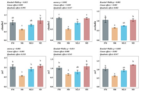 As shown in Figure 2, compared with the FM group, the mRNA expression levels of claudin1, claudin2, occludin, zo1, zo2, and zo3 in the intestine of hybrid sturgeon significantly decreased in the M0 group (p < 0.05). These levels significantly increased in the M5 group compared to the M0 group (p < 0.05).
