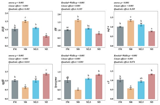 As shown in Figure 3, compared with the FM group, the expression of il8 was significantly upregulated while tgfβ and c3 were significantly downregulated in the M0 group (p < 0.05). Compared with the M0 group, the expression of il1β, il8, and tnfα was significantly downregulated while the expression of tgfβ, lysozyme, and c3 was significantly upregulated in the M5 group (p < 0.05).