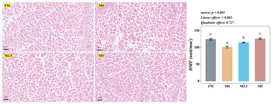 Effects of replacing fish meal with soybean protein concentrate and supplementing methionine on muscle structure of hybrid sturgeon (A. baerii ♀ × A. schrenckii ♂) (n = 6). Notes: Crosscut—H&E staining (×100). DMF represents density of muscle fiber. Different letters indicate that the difference is statistically significant at a significance level of p < 0.05. Different superscript letters in the figure indicate significant differences between groups. The orthogonal polynomial method is used to evaluate the effect of the methionine supplemental level on the parameters of the SPC replacement of FM group, which are divided into linear type and quadratic type.