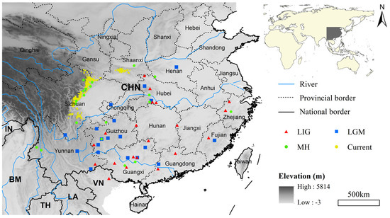 Occurrence data for giant pandas in the current era are from the Third National Giant Panda Survey (1999–2003) [55]. This study filtered the data to ensure that each grid retained at most one data point, resulting in a total of 328 data points for subsequent modelling (Figure 1). A total of 191 fossil records (duplicates excluded) for giant pandas were obtained from the Database of Vertebrate Paleontology and Paleoanthropology, the Paleobiology Database (https://paleobiodb.org, accessed on 8 March 2023), as well as from the published literature from 1974 to 2018 [47,48,54,56,57,58]. These fossil records have well-defined geological ages, with 60 of them further providing relatively specific radiocarbon dating or uranium-series dating information, accounting for approximately 31.94% of the total fossil records. The dating of fossils typically involves a certain degree of uncertainty [59]. In this study, a relatively broad time range (±10,000 years) was chosen to accommodate measurement errors, avoiding the problem of insufficient sample size caused by overly strict time constraints, which could affect the reliability of the model. Subsequently, we used the geological age information from fossil records, and those described as early the Late Pleistocene were assigned to LIG, those described as the Late Pleistocene end were assigned to LGM, and those described as Holocene were assigned to MH. Consequently, we obtained 20 fossil records from the LIG period, 20 from the LGM period, and 20 from the MH period (Figure 1). Additionally, there were 28 fossil records with uncertain specific dating information within the Late Pleistocene, which were utilized to verify the accuracy of predictions. The remaining 103 fossil records were excluded from the analysis. For fossil records without latitude and longitude information, we used the coordinate picking system of Baidu Maps to obtain data based on the fossil location description (https://api.map.baidu.com/lbsapi/getpoint/index.html, accessed on 20 September 2021).