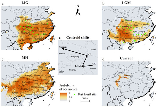 The range of giant pandas during the Last Interglacial (a), the Last Glacial Maximum (b), the Mid-Holocene (c), and current period (d), and range shifts since the Last Interglacial (e). The direction and length of the arrows represent the direction and distance of shift. The green solid circles indicate undated giant panda fossils since the LIG.