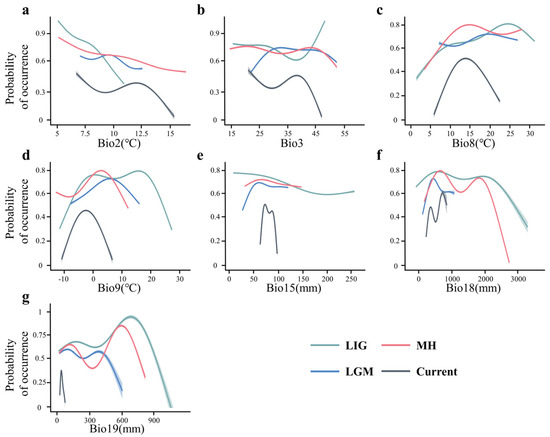 Response curves of giant pandas to seven climate variables during the Last Interglacial (green), the Last Glacial Maximum (blue), the Mid-Holocene (red), and the current period (black). (a) Bio2, mean diurnal temperature range; (b) Bio3, Iiothermality; (c) Bio8, mean temperature of wettest quarter; (d) Bio9, mean temperature of driest quarter; (e) Bio15,precipitation seasonality), (f) Bio18, precipitation of warmest quarter; (g) Bio19, precipitation of coldest quarter.
