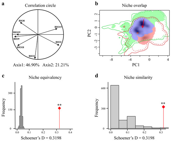 - Broennimann, O.; Fitzpatrick, M.C.; Pearman, P.B.; Petitpierre, B.; Pellissier, L.; Yoccoz, N.G.; Thuiller, W.; Fortin, M.-J.; Randin, C.; Zimmermann, N.E.; et al. Measuring ecological niche overlap from occurrence and spatial environmental data. Glob. Ecol. Biogeogr. 2012, 21, 481–497. [Google Scholar] [CrossRef]