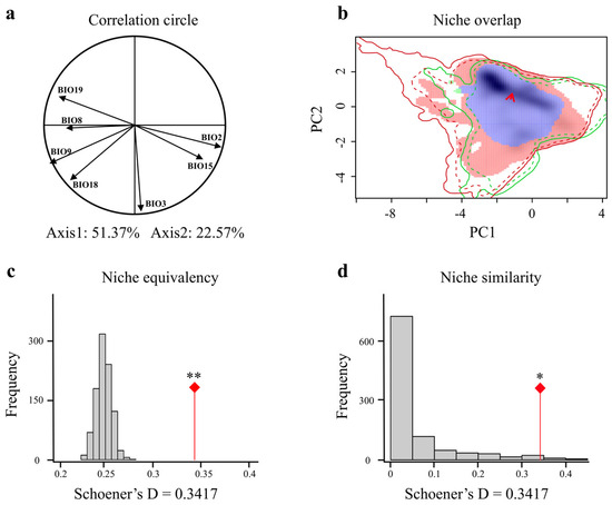 Comparison of climatic niches of giant pandas during the Last Glacial Maximum (LGM) and Mid-Holocene (MH). (a) Each climatic variable is described in the correlation circle along the two PCA axes. (b) Giant pandas in the LGM (green) and MH (red) climatic niches, with overlapping regions in purple, showing that the LGM distribution (green) is entirely encompassed within the overlapping purple area. Red arrows connect the centroid of niches. The outer solid line represents the climatic conditions for each period (green: LGM; red: MH), and the dashed line represents 50% of the climatic conditions in the study area for each period. Equivalence test (c) and similarity test (d) of climatic niches of giant pandas in the LGM and MH. The red line with a diamond indicates the observed niche overlap Schoener’s D, and the gray bar indicates the simulated niche overlap. ** indicates highly significant (p < 0.01), and * indicates significant (p < 0.05).