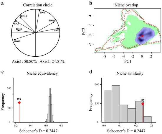 Comparison of climatic niches of giant pandas during the Mid-Holocene (MH) and current period. (a) Each climatic variable is described in the correlation circle along the two PCA axes. (b) Giant pandas in the MH (green) and current (red) climatic niches, with overlapping regions in purple, showing that the current distribution (red) is entirely encompassed within the overlapping purple area. Red arrows connect the centroid of niches. The outer solid line represents the climatic conditions for each period (green: MH; red: current), and the dashed line represents 50% of the climatic conditions in the study area for each period. Equivalence test (c) and similarity test (d) of climatic niches of giant pandas in the MH and current period. The red line with a diamond indicates the observed niche overlap Schoener’s D, and the gray bar indicates the simulated niche overlap. The ns indicates not statistically significant.