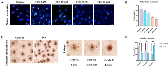 TCS impedes nuclear maturation in oocytes. (A) Representative micrographs of nuclear staining treated with different concentrations of TCS (2, 20, 40, 60 μmol/L). MII oocytes are indicated by white arrows. Scale bar = 100 µm. (B) Rate of the first polar body extrusion in different groups. Distinct letters positioned above the columns signify significant differences. (C) Representative morphology of COCs expansion in the control and TCS groups. “D” represents the diameter of the oocyte, and “L” represents the diffusion diameter of the cumulus cells. Scale bar = 300 µm, Enlarge: Scale bar = 100 μm. (D) The proportion of different grades of cumulus expansion in the control and TCS groups (ns p > 0.05, ** p < 0.01).