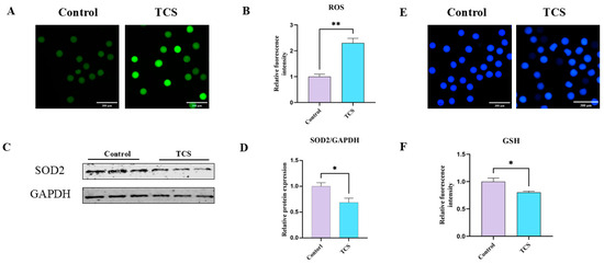 TCS exposure affects oxidative stress levels in oocytes. (A) Representative fluorescence images of ROS in control and TCS. Scale bar = 300 µm. (B) Quantitative analysis of ROS fluorescence intensity under control and TCS (** p < 0.01). (C) Protein expression of SOD2 and GAPDH was assessed in control and TCS. (D) Normalized SOD2/GAPDH expression ratios (* p < 0.05). (E) Representative GSH fluorescence images in control and TCS. Scale bar = 300 µm. (F) Relative GSH fluorescence intensity was quantified and compared between the control and TCS (* p < 0.05).