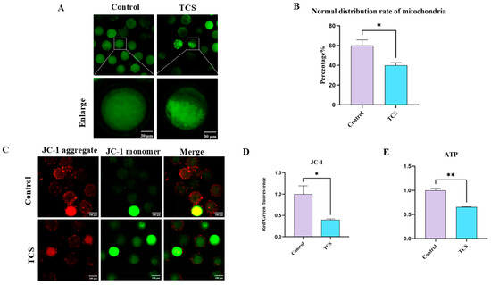 TCS affects the functioning of mitochondria in oocytes. (A) Representative micrographs show mitochondrial distribution from control and TCS. Scale bar = 30 μm. (B) The normal distribution rate of mitochondria was measured in control and TCS conditions (* p < 0.05). (C) Representative images illustrate ΔΨm in control and TCS conditions. Scale bar = 100 μm. (D) The red/green fluorescence ratio was quantified and compared between control and TCS conditions (* p < 0.05). (E) ATP levels were measured and compared between control and TCS conditions (** p < 0.01).