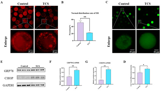 TCS exposure affects endoplasmic reticulum (ER) functions in oocytes. (A) Fluorescence micrographs depicting ER distribution in control and TCS-treated oocytes. Scale bar = 30 μm. (B) The normal distribution rate of ER was measured in control and TCS conditions (** p < 0.01). (C) Representative micrographs of Ca2+ in control and TCS. Scale bar = 30 µm. (D) Quantitative analysis revealed a significant increase in Ca2+ fluorescence intensity in TCS-treated oocytes (* p < 0.05). (E) Western blot analysis of GRP78, CHOP, and GAPDH protein expression in control and TCS. (F,G) Normalized expression ratios of GRP78/GAPDH and CHOP/GAPDH were significantly elevated in TCS-exposed oocytes (** p < 0.01).