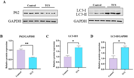 TCS exposure affects autophagy in oocytes. (A) Western blot analysis for the protein LC3-II/I, SQSTM1 (P62), and GAPDH expression in control and TCS. (B–D) The ratios of P62/GAPDH, LC3-II/I and LC3-II/GAPDH expression were normalized (* p < 0.05, ** p < 0.01).