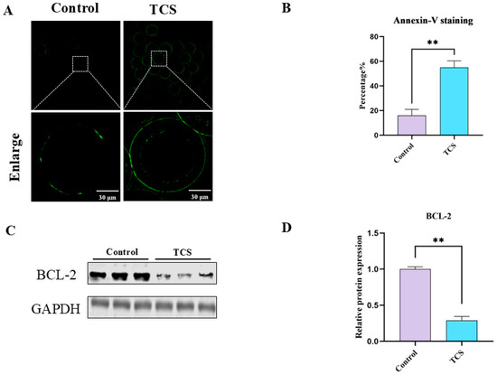 TCS exposure affects early apoptosis in oocytes. (A) Representative micrographs of early apoptosis were detected by Annexin-V in the control and TCS. Scale bar = 30 μm. (B) The ratios of early apoptosis were recorded in the control and TCS (** p < 0.01). (C) Western blot analysis for the protein BCL-2 and GAPDH expression in control and TCS. (D) The ratio of BCL-2 to GAPDH expression was normalized (** p < 0.01).