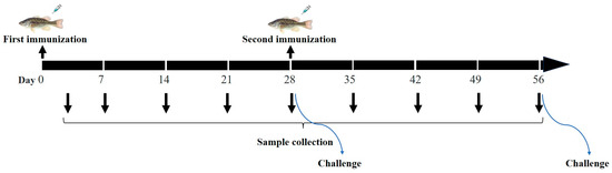 Prior to sampling, all the fish were anesthetized with MS-222 (1 mg/mL, pH = 7.2) which was moderate pH with NaHCO3. At each time point (1, 3, 7, 14, 21, 28, 35, 42, 49 and 56 days after the primary immunization (dpi), three fish in each tank were collected for blood draw. The collected blood was clotted for 2 h at 4 °C and centrifuged. After centrifuge, the blood was separated to two layers, and the upper layer serum was collected. The head kidney from all above fish were collected and stored in TRIzol Reagent (Invitrogen, Carlsbad, CA, USA).