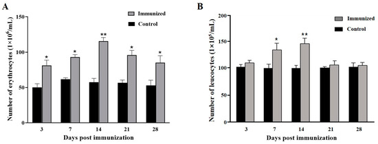 Compared to the control group, the number of erythrocytes of the immunized group increased at day 3 after the primary immunization, peaked at day 14 ((115 ± 6) × 106/mL), then decreased, but remained higher than those of the control group. In the control group, the number of erythrocytes were maintained at (50 ± 5) × 106/mL (Figure 2A). The number of leucocytes increased at day 7 after the primary immunization and reached a peak at day 14 ((146 ± 9) × 105/mL) in the immunized group. In the control group, the number of leucocytes were maintained at about (100 ± 5) × 105/mL (Figure 2B).