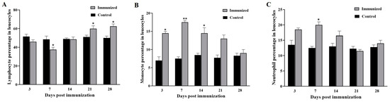 Changes in the differential leukocyte counts of lymphocytes (A), monocyte (B) and neutrophil (C) in the peripheral blood of Micropterus salmoides immunized with inactivated LMBRaV. Three replicates were set for the tests, with three fish per replicate. Data are presented as mean SD. * p ≤ 0.05; ** p ≤ 0.01.