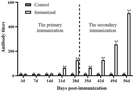 Serum antibody titers of Micropterus salmoides immunized with inactivated LMBRaV. The neutralization titers were expressed as reciprocal values of the sera dilution given without CPE in the well with EPC cells inoculated with LMBRaV. Three replicates were set for the tests, with three fish per replicate. Data are presented as mean SD. ** p ≤ 0.01.