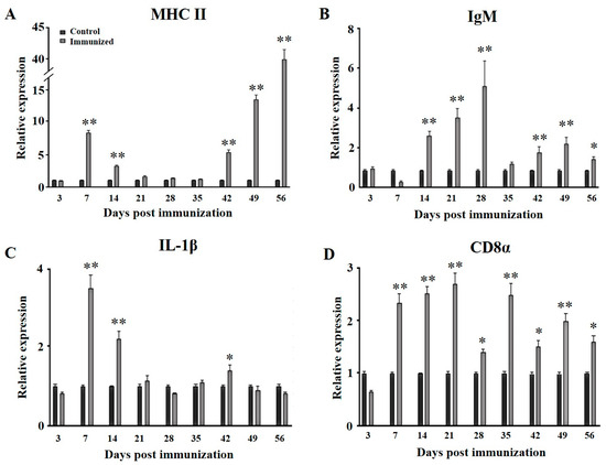 qRT-PCR analysis of the expression levels of immune-related genes of the head kidney postvaccination. (A): Expressions of mhcⅡ in the head kidney, (B): expressions of IgM in the head kidney, (C): expressions of IL1β in the head kidney, (D): expressions of CD8α in the head kidney. The mRNA level of each gene was normalized in reference to the expression of the β-actin gene. For each gene, the mRNA level of the control animals was set as 1. Three replicates were set for the tests, with three fish per replicate. Data are presented as mean SD. * p ≤ 0.05; ** p ≤ 0.01.