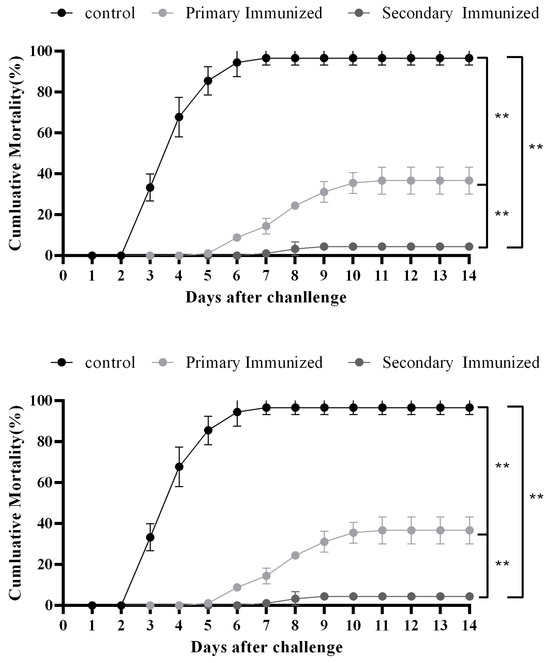 Cumulative mortality curves of immunized and control Micropterus salmoides after LMBRaV infection. Three replicates were set for the tests. ** p ≤ 0.01.
