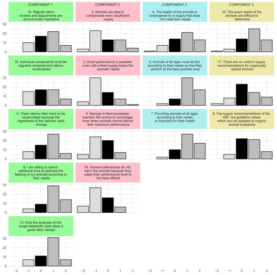 While the majority of farmers disagreed, a small number believed that animals were able to compensate for inadequate nutrition (e.g., due to using home-grown components with unfavourable nutrient levels) by reducing performance and that reduced performance was economically outweighed by reduced feed costs (statements 2, 3, 5, and 16). Component 2 (‘compensation’), therefore, resembles an attitude that is based on the conviction that animals can compensate for an undersupply, e.g., by adjusting their performance, and are therefore not adversely affected by a shortage of nutrients. Items with a high loading on this component also express that an undersupplied animal can still perform sufficiently and that a potential underperformance would be compensated for by lower feed costs.