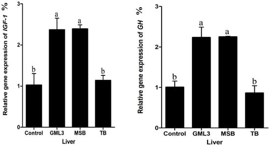 Relative expression levels of hepatic insulin-like growth factor-1 (IGF-1) and growth hormone (GH) genes in fish fed control, GML, MSB, and TB diets. Different letters on bars show significant difference (p < 0.05). a, b letters indicate statistical significance between the diet groups. a vs. b show a significant difference.