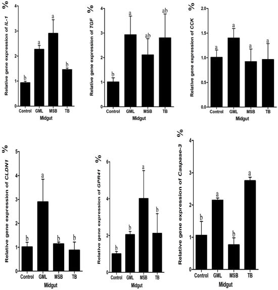 Relative expression levels of interleukin-1 (IL-1), transforming growth factor (TGF), cholecystokinin (CCK), claudin-1 (CLDN1), caspase-3 (CAS-3), and G protein-coupled receptor 41 (GPR41) genes in the midgut of fish fed control, GML, MSB, and TB diets. Different letters on bars show significant difference (p < 0.05). a, ab, b letters indicate statistical significance between the diet groups. a and ab are not significantly different, while a vs. b show a significant difference.