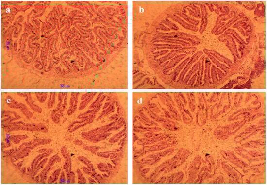 The results of the intestinal morphometric parameters are presented in Table 9. The light microscope photomicrographs of the foregut section of the fish are shown in Figure 3 (×40) and Figure 4 (×100), while SEM photomicrographs of the foregut section are shown in Figure 5. Multiple signs of damage were found in the guts of fish fed a high soybean-based control diet, including a significant reduction in villus height (VH), crypt depth (CD), villus height/crypt depth ratio (VH/CD) ratio, and finally a reduction in the number of goblet cells/villus height (GC/VH). MSB, GML, and TB had significantly greater VH, CD, VH/CD, and GC/VH ratios than controls (p > 0.05). Fish given MSB, GML, or TB diets had normal morphological structure, including intact villus folds (Figure 3a–d and Figure 4a–d) and a broad absorptive surface brimming with microvillus (Figure 3a–d and Figure 4a–d).
