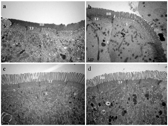 Microvilli density was measured using SEM photomicrographs captured at 35,000× magnification, with three images analyzed per dietary treatment. Microvilli were identified based on their characteristic round shape in the images. The number of microvilli was counted within a 1 μm2 area, with three areas chosen per image. Image-Pro Plus 6.0 (Media Cybernetics, Inc., Tokyo, Japan) software was used for the analysis.
