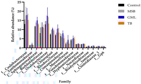 The immunological and antioxidant parameters of fish hindgut and midgut are shown in Table 7. The TP, LZM, ALB, IgM in hindgut, and TP, ALB, T-AOC, and IgM in midgut were not affected (p > 0.05) in any of the groups. However, T-AOC in control and TB groups were significantly lower, compared to GML, and MSB in hindgut, and the LZM level in midgut was significantly lower in the control, MSB, and TB as compared to GML (p < 0.05).