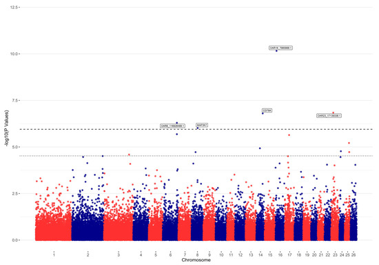 Manhattan plots were utilized to visualize the −log10 (p-value) of all SNPs relative to their positions on associated chromosomes. Genome-wide and chromosome-wide significance thresholds, determined using Bonferroni correction, were applied to minimize Type-I Error rates arising from multiple testing of SNPs. Accordingly, the genome-wide significance threshold was set at 1.11 × 10−6 (0.05/44,871), and the chromosome-wide significance threshold was set at 2.89 × 10−5 ((0.05/44,871) × 26).