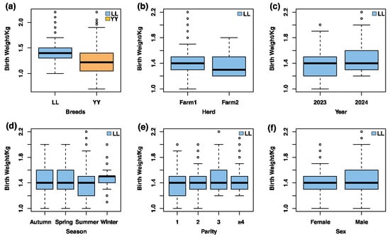 Boxplot of factors influencing birth weight in pigs. LL represents Landrace pigs, and YY represents Yorkshire pigs: (a) effects of breed on birth weight in the total population (LL and YY); (b) effects of herd on birth weight in the Landrace pigs; (c) effects of year on birth weight in the Landrace pigs; (d) effects of season on birth weight in the Landrace pigs; (e) effects of parity on birth weight in the Landrace pigs; (f) effects of sex on birth weight in the Landrace pigs. Circles indicate values beyond Q3 + 1.5 × IQR or below Q1 − 1.5 × IQR, where Q1, Q3, and IQR stand for the first quartile, third quartile, and interquartile range respectively.