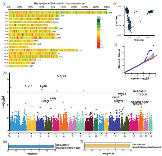 GWAS identified SNPs and candidate genes affecting birth weight in Landrace pigs. (a) Genomic distribution of SNP loci that passed quality control; (b) principal component analysis (PCA) of the Landrace population; (c) Q-Q plot assessing the reliability of the GWAS, the red line is the theoretical quantile line; (d) Manhattan plot showing the GWAS results; (e) functional enrichment of candidate genes in GO parent biological processes; (f) functional enrichment of candidate genes in GO biological processes.