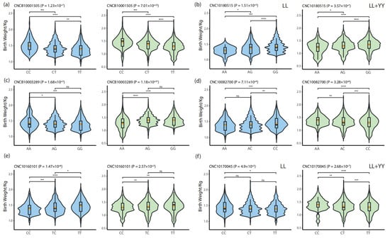 Violin plots illustrating birth weight distributions across three genotypes for each locus assessed using the KW test. Blue indicates the discovery population (LL), and green represents the validation population (LL + YY). (a) CNCB10001505; (b) CNC10180515; (c) CNCB10003289; (d) CNC10082700; (e) CNC10160101; (f) CNCB10009475. Significance markers: **** represents p ≤ 0.0001, *** represents p ≤ 0.001, ** represents p ≤ 0.01, * represents p ≤ 0.05, and ns represents no statistical significance (p ≥ 0.05).