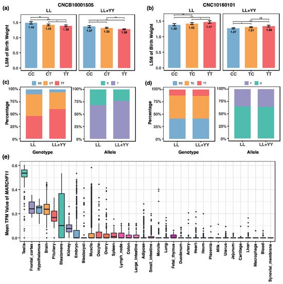 Key SNPs and MARCHF11 gene associated with birth weight in the discovery (LL) and validation (LL + YY) populations. (a,b) Least-squares means of birth weight across three genotypes for CNCB10001505 and CNC10160101; (c,d) phenotype and allele percentages for CNCB10001505 and CNC10160101; (e) gene expression of the MARCHF11 gene in different pig tissues. *** represents p ≤ 0.001, ** represents p ≤ 0.01, * represents p ≤ 0.05.