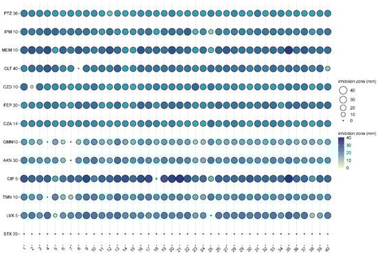 Antibiograms of the 40 different canine otitis externa P. aeruginosa isolates (1-40: first column with bold), represented in balloon plot. Abbreviations of the used antibiotics: piperacillin + tazobactam 30/6 µg (PTZ 36), imipenem 10 µg (IPM 10), meropenem 10 µg (MEM 10), ceftolozane + tazobactam 30/10 µg (CLT 40), ceftazidime 10 µg (CZD 10), cefepime 30 µg (FEP 30), ceftazidime + avibactam 10/4 µg (CZA 14), gentamicin 10 µg (GMN10), amikacin 30 µg (AKN 30), ciprofloxacin 5 µg (CIP 5), tobramycin 10 µg (TMN 10), levofloxacin 5 µg (LVX 5), and trimethoprim + sulfamethoxazole 1.25/23.75 µg (STX 25).