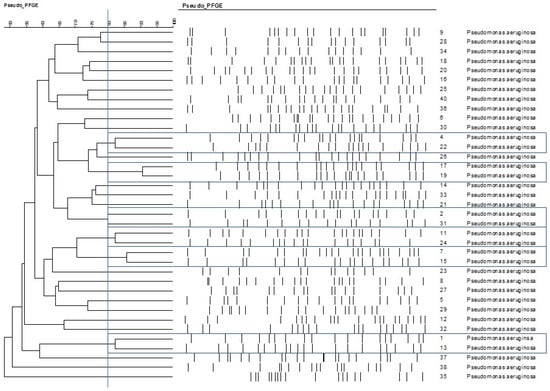 Relationships among the otitis externa Pseudomonas aeruginosa isolates, represented on cladogram. The cut-off point for different PFGE types was 80% similarity, labelled with the bue vertical line. Based on that criteria closely related isolate pairs are framed with blue lines.