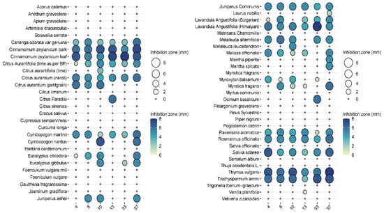 Results of the antimicrobial tests performed with the 57 essential oil solutions at 2.5%. The diameters of the inhibition zones of 10 μL drops are expressed in mm and shown as circles on the balloon plots.