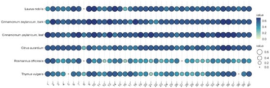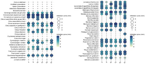 Antibacterial efficacy of the 5% suspensions of the six selected EOs on the 40 different otitis externa P. aeruginosa isolates. The plots represent the sizes of the inhibition zones of the bacterial lawns on the 40 different P. aeruginosa isolates. The colors and circles represent the diameters of the inhibition zones in mm.