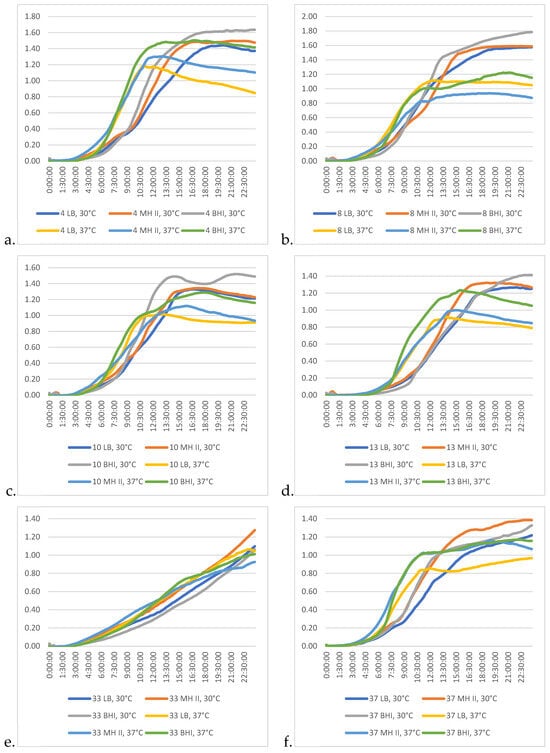 Isolate 33 (Figure 6e) showed the most different growth characteristics, as the 24 h incubation time was not sufficient for this bacterium to reach the stationary phase. This characteristic was somewhat similar in the case of isolate 37 (Figure 6f), but in this latter case the progression of the kinetic curve was more moderate, and by the 10th and 13th hours of the incubation, the intensity of the logarithmic phase was broken and the ramp-up of the curve became more moderate. However, by this time, other isolates had already reached the stationary phase (8; Figure 6b) and were already beginning to enter the declination phase (4, 10, 13; Figure 6a,c,d). This characteristic feature was dependent on the medium used.